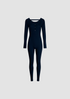 Slim-fit long sleeve one-piece with a round neckline, open back design, four snap buttons on the front, and "K" embroidery on the lower left leg.