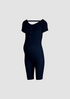 Maternity slim-fit short sleeve one-piece with a round neckline, open back design, four snap buttons on the front, and textured ribbed fabric.